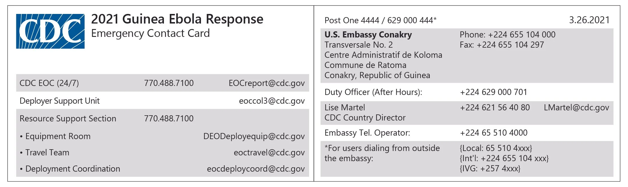 Print ready emergency contact cards created for deployers specific for each response and location. These cards were reviewed and updated almost bi-weekly to ensure deployers always had the most up-to-date contact info for their deployment. Some of these locations had spotty internet or none at all, so having these on the site ready to print out and wallet sized for easy carry.