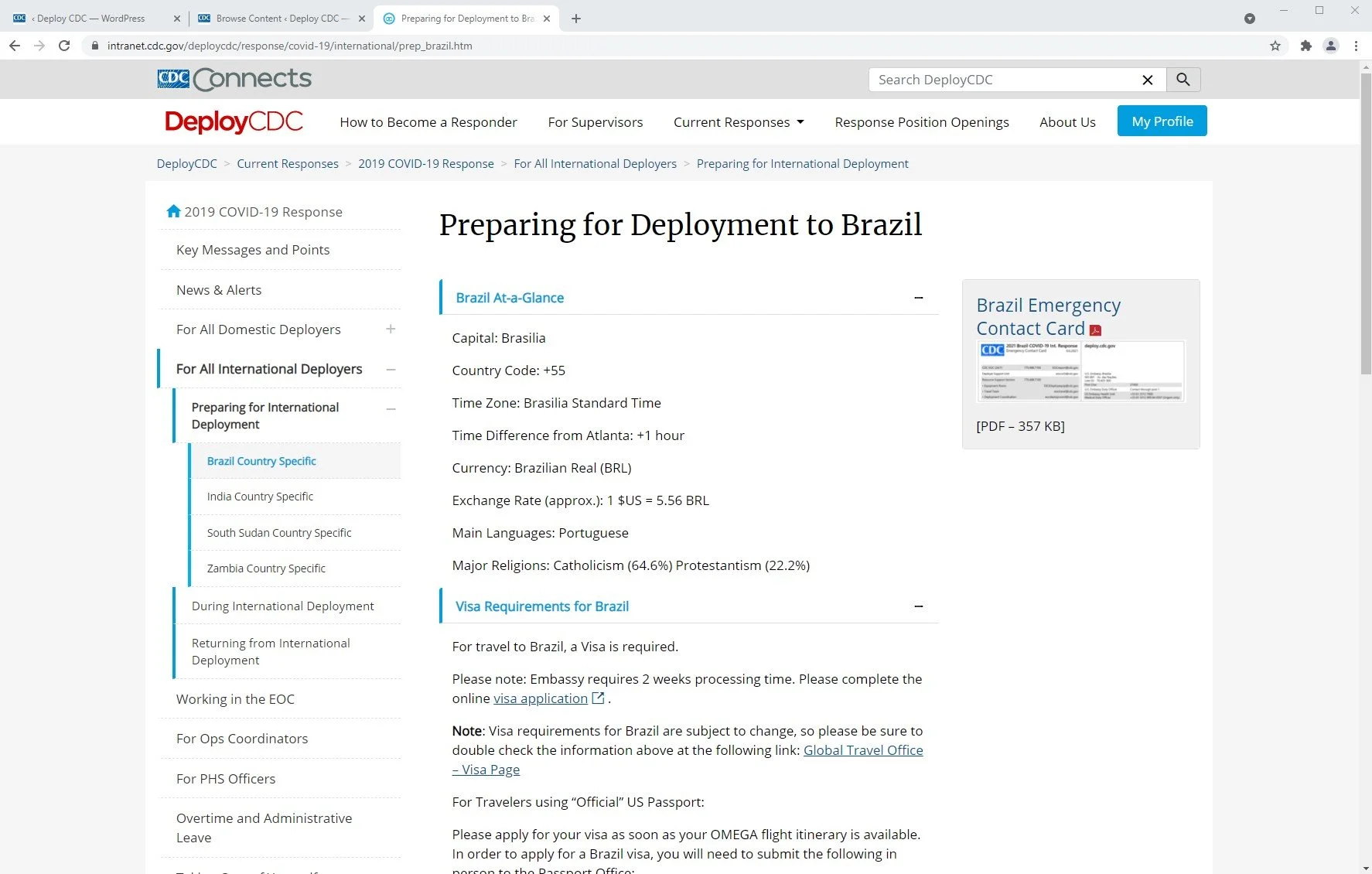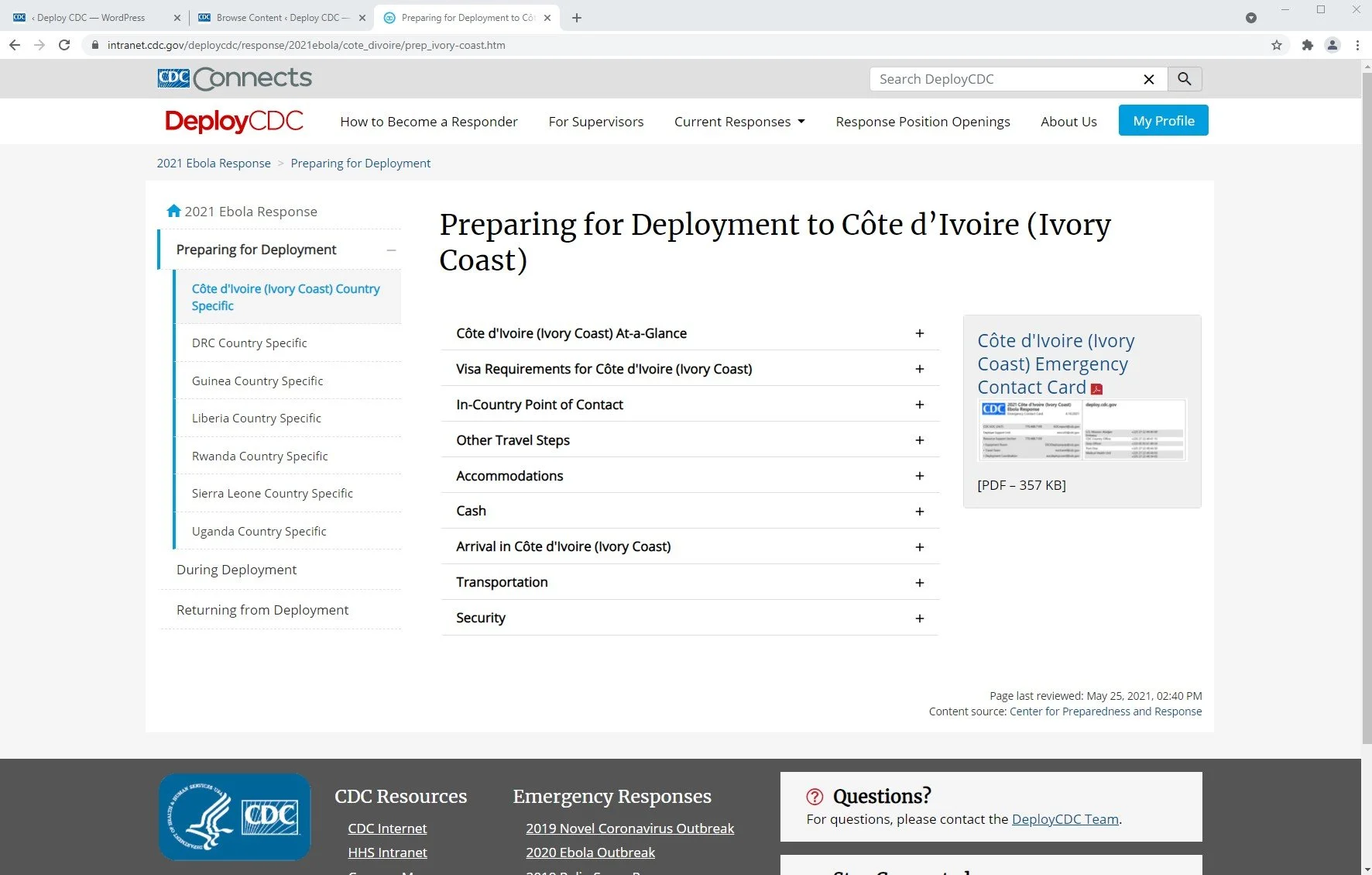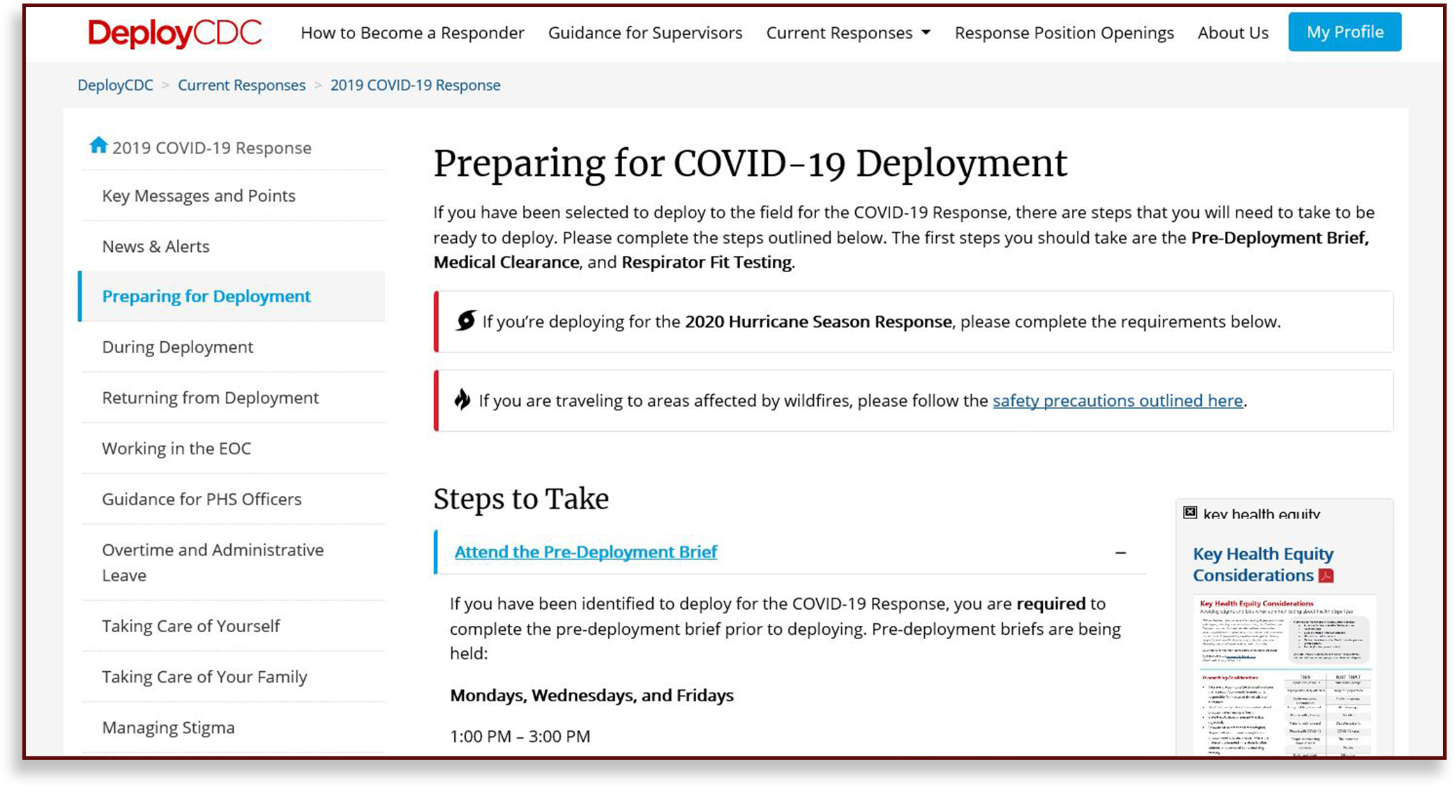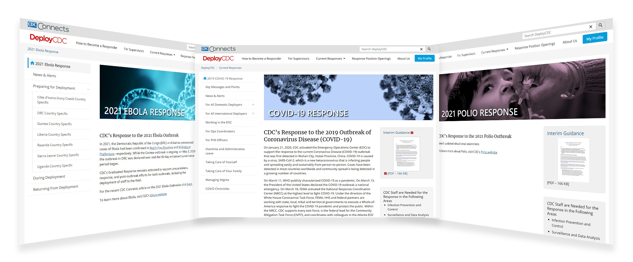 Implemented design layout to better organize content for DeployCDC Covid-19, 2021 Ebola, and 2021 Polio Response Deployments