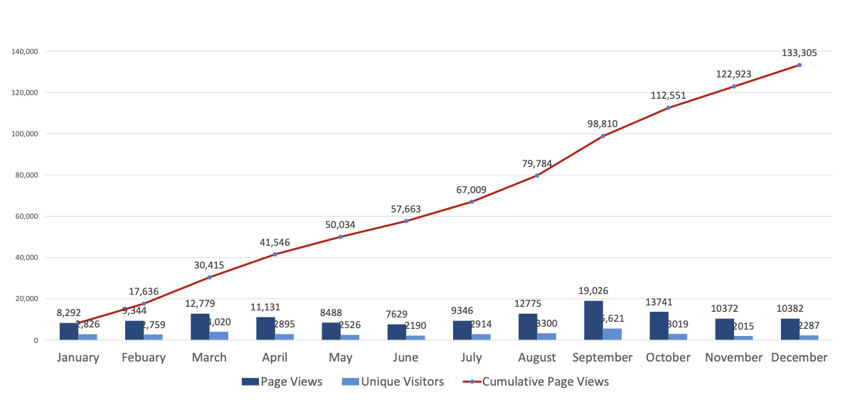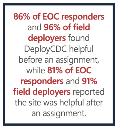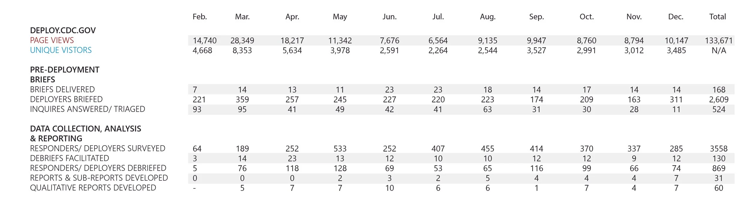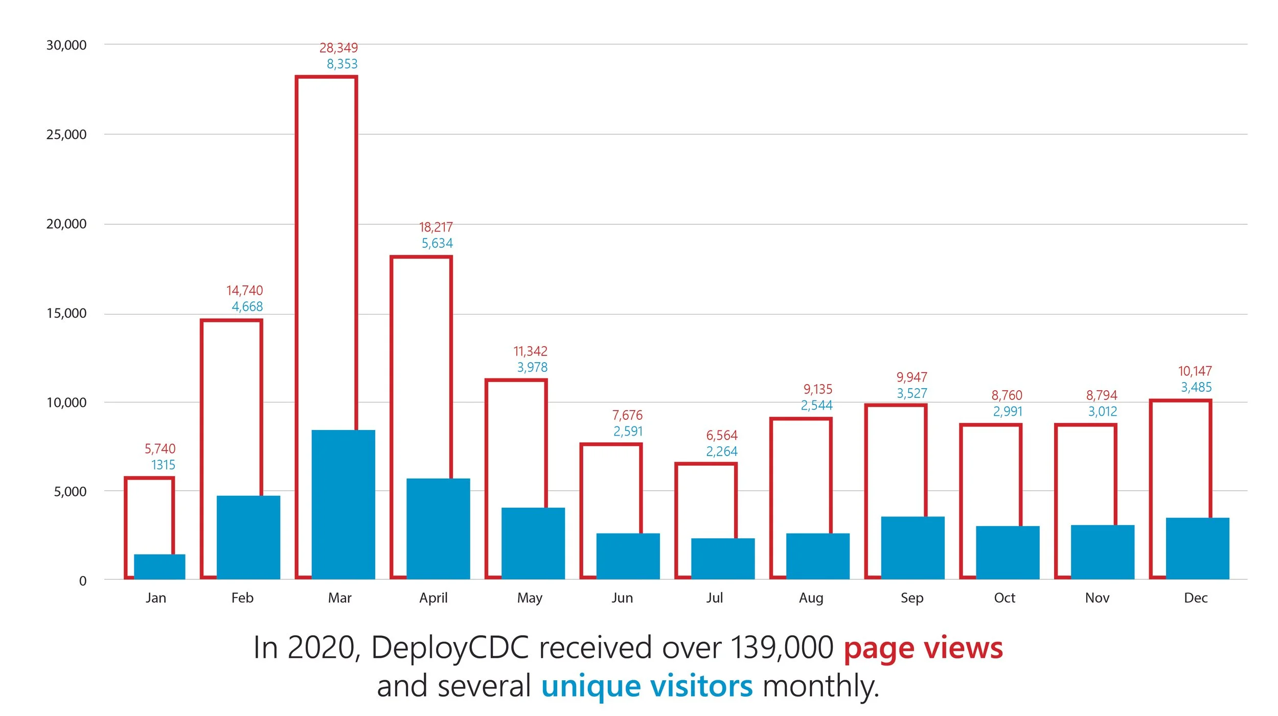 In 2021, DeployCDC received 133,305 total page views. At its peak in September 2021, the site had more than 19,000 page views and over 5,600 unique visitors.
